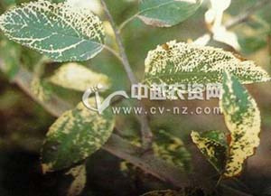 (二)果樹黃葉病是由于植物組織內(nèi)鐵的缺乏而造成的一種生理性病害。其癥狀是先從果樹新梢的頂端嫩葉開始變黃,越往枝節(jié)下端,老葉黃葉現(xiàn)象越輕。缺鐵輕微時,葉片葉肉變黃,葉脈兩側(cè)仍為綠色,呈綠色網(wǎng)紋狀;缺鐵嚴(yán)重時,葉片失綠加重,變成白色,并在失綠部分出現(xiàn)銹褐色枯斑或葉緣變得焦枯,引起落葉。